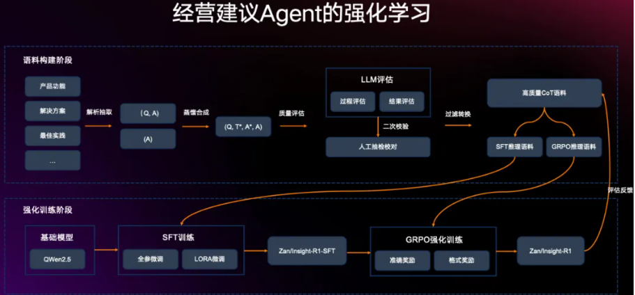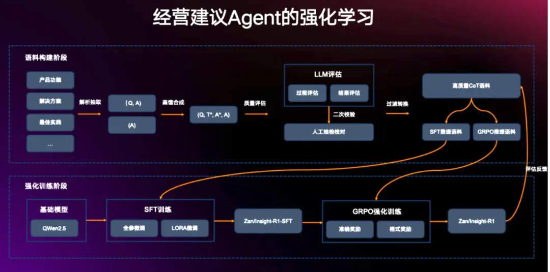 当然,我们也在经营分析场景中基于 SFT(监督微调)和强化学习进行微调。我们之前基于经营分析 Agent 构建的数据集和评价体系,天然地过渡到了 RL(强化学习)领域的环境和奖励函数的构建。我们之前评价一个经营建议好坏的一个重要指标是思考过程是否符合 AARRR 模型,现在在 RL 中,这个指标也成为了奖励函数之一。