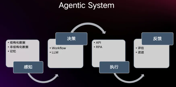 尽管目前对 Agent 的定义还没形成共识,但是大家对 Agentic System(智能系统)基本的共识是:Agentic System 是一种有目标、基于环境的决策系统。与 LLM 最大的区别在于,Agentic System 可以与现实世界交互,从感知环境开始,做出决策并执行,影响环境,然后基于反馈调整,不断持续迭代循环。