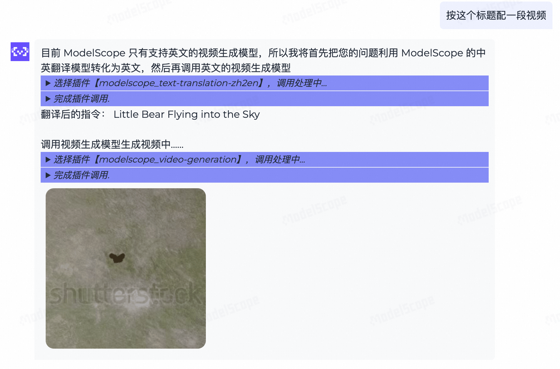 虽然生成的视频可能较为简单,但它清晰地展示了 “自然语言 → 工具调用 → 可视化结果” 的完整链路。更重要的是,这种链路是可扩展的——如果你有更好的视频生成模型,只需替换插件实现即可。