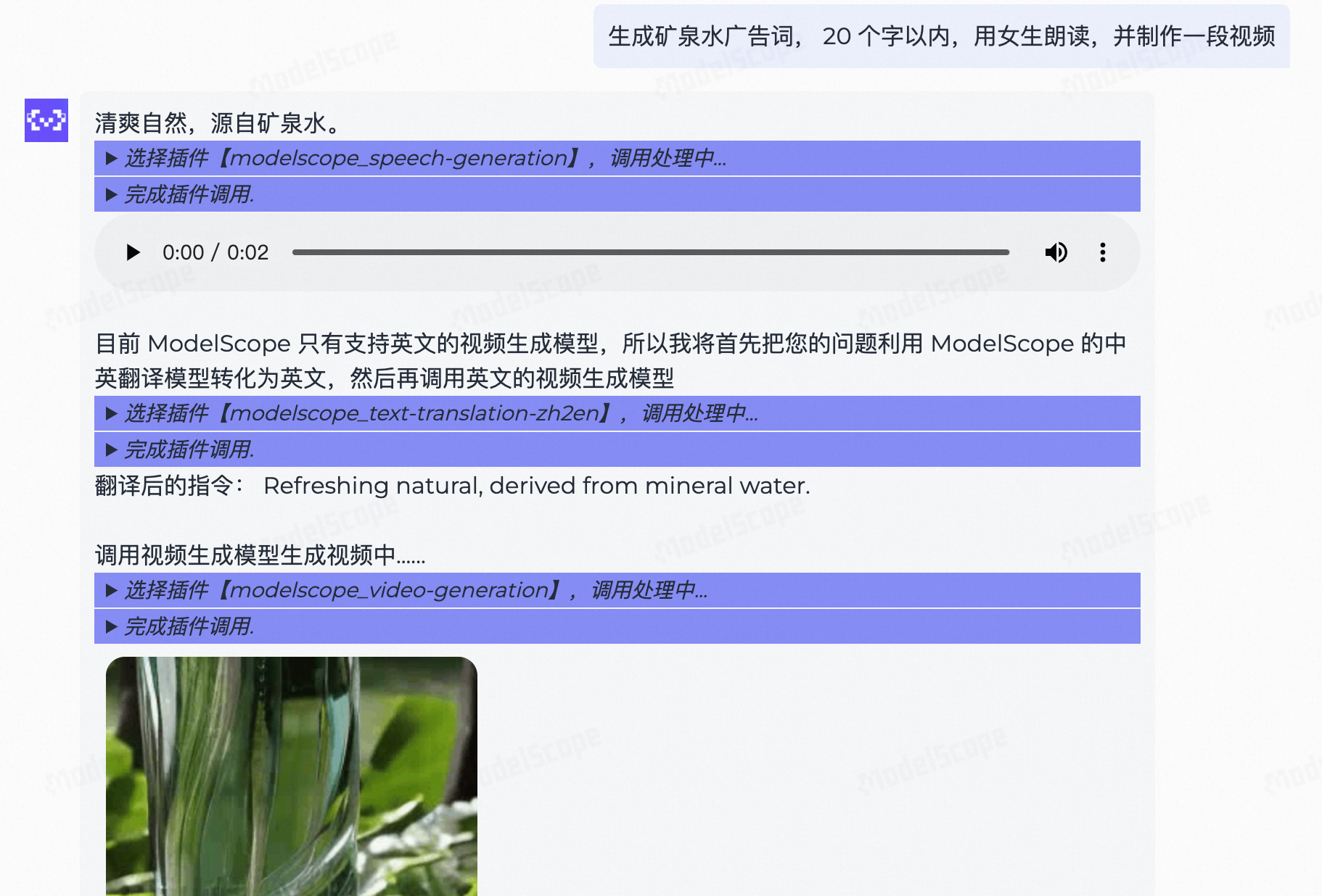 目前这个在线演示工具的能力比较基础,因此我们可以要求模型只生成20个字以内的广告词,语音合成的模型能力比较稳定,语音效果较好。