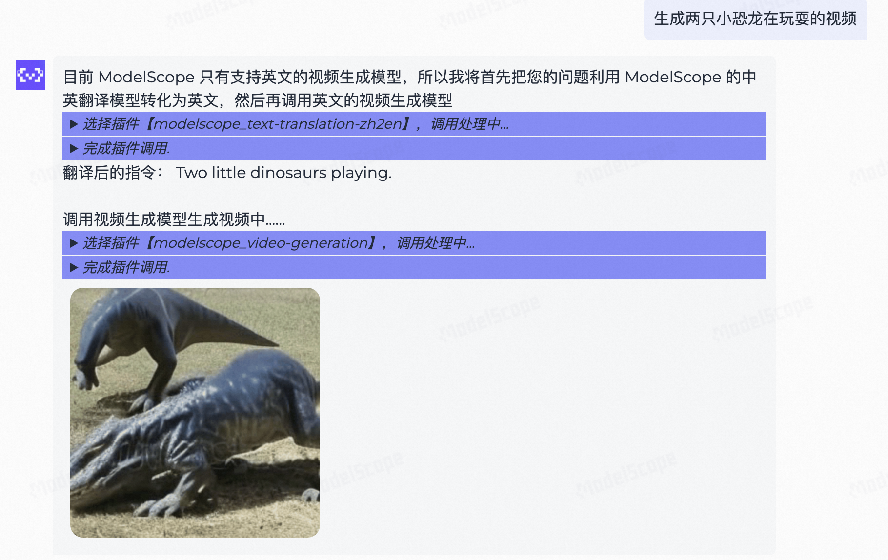 | video-generation | 视频生成 | MODELSCOPE_API_TOKEN 需要在环境变量中进行配置 |