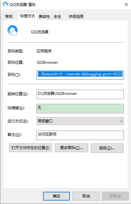 win:D:\浏览器\QQBrowser\QQBrowser.exe -sc=desktopshortcut -fixlaunch=0 —debugging-port=9222